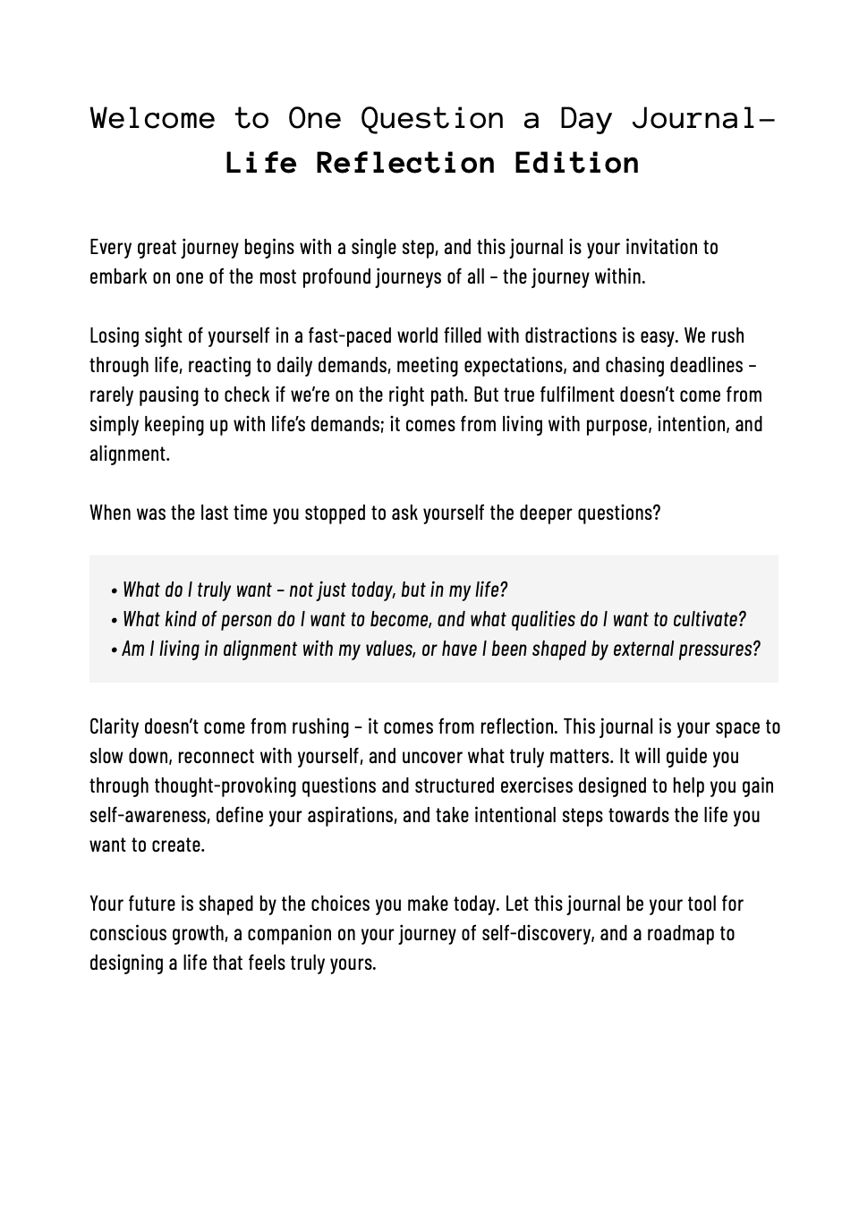 💠Explore the art of journaling. Through one powerful question a day, this journal cultivates self-awareness, clarity, and confidence. You’ll explore your values, strengths, emotions, limiting beliefs, and life lessons — gaining insight into what drives you, what holds you back, and what truly matters. In just a few minutes a day, build the foundation for more intentional decisions, personal growth, and a life aligned with your truth.