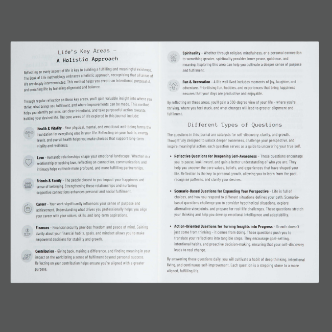 Inside One Question a Day Journal - Life Reflection Edition, you’ll find a guided six-month journey of daily and weekly reflection, created to help you slow down, gain clarity and grow with intention.